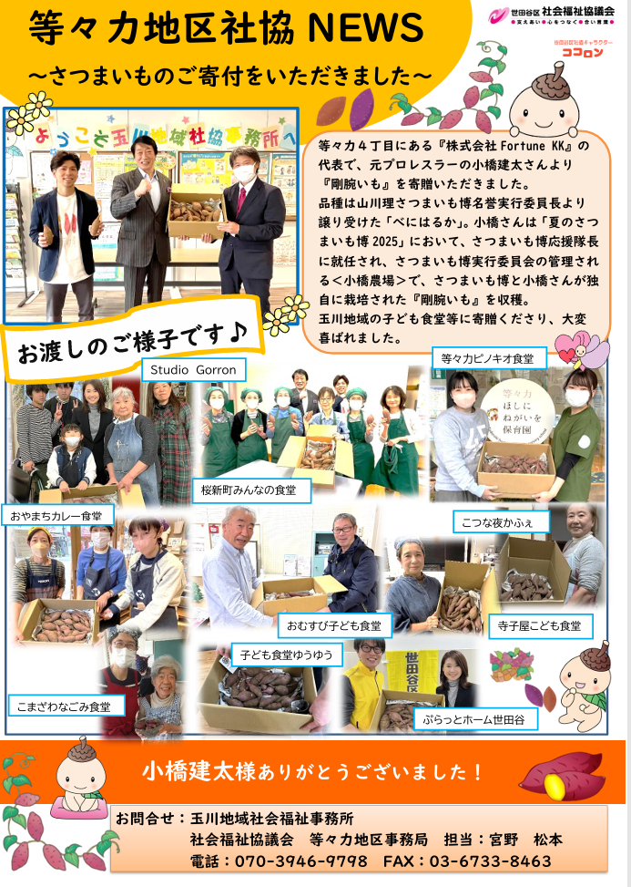この度、「さつまいも博応援隊長」小橋建太が、さつまいも博実行委員会と一緒に、<小橋農場>で作った『剛腕いも』(品種:べにはるか)を社会福祉法人世田谷区社会福祉協議会ご協力のもと、世田谷区玉川地域の「子ども食堂」等へ寄贈いたしましたので、ここにお知らせいたします。